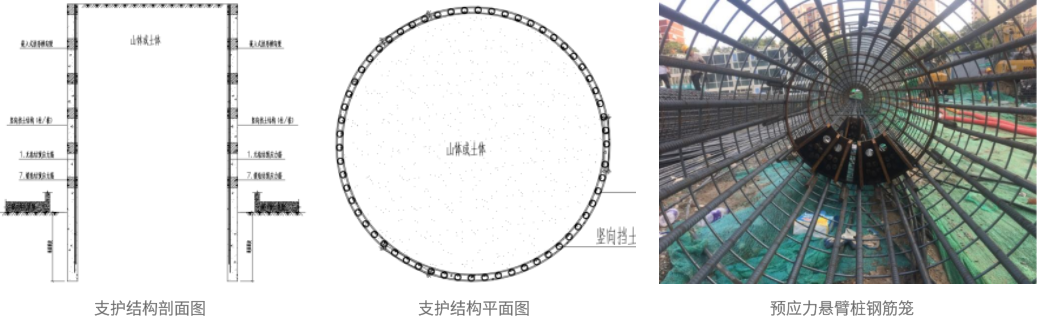 主動(dòng)控制永久性(拱圈)預(yù)應(yīng)力懸臂樁基坑技術(shù)可針對(duì)以往必須采用內(nèi)支撐(周邊無足夠空間)的基坑或無法采用樁錨的外環(huán)形基坑(如古樹保護(hù)、山體支護(hù)等)進(jìn)行優(yōu)化,在樁頂和樁深采用預(yù)先加載反向應(yīng)力應(yīng)變,提前抑制基坑水平荷載和變形,達(dá)到節(jié)省工期和造價(jià)的目的。相比原方案,基坑造價(jià)降低35%-60%,土方造價(jià)節(jié)約20%以上,工期節(jié)約50%以上。以往必須采用內(nèi)支撐(周邊無足夠空間)的基坑或無法采用樁錨的外環(huán)形基坑(如古樹保護(hù)、山體支護(hù)等)。