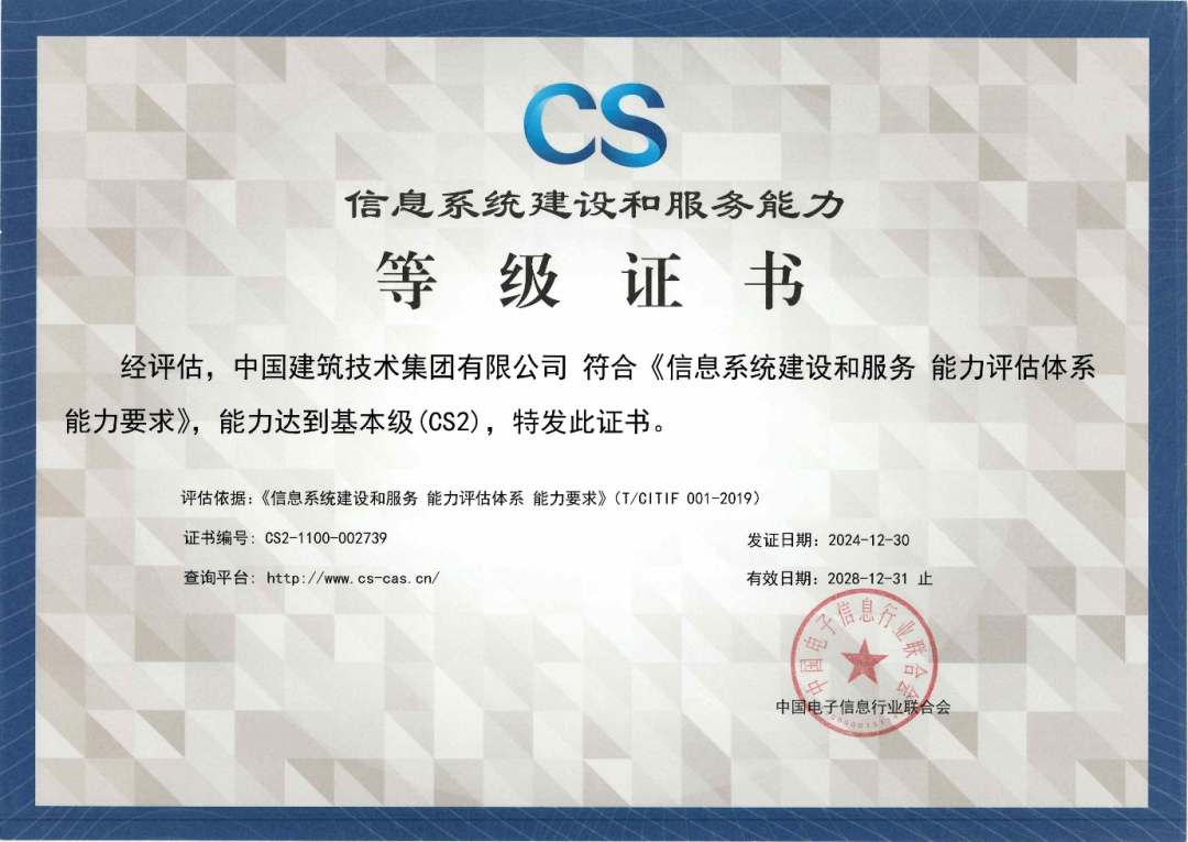 近日,中國建技成功通過中國電子信息行業(yè)聯(lián)合會(huì)評(píng)審,榮獲CS2信息系統(tǒng)建設(shè)和服務(wù)能力認(rèn)證。這是中國建技繼質(zhì)量、環(huán)境、職業(yè)健康安全、信息技術(shù)服務(wù)、信息安全管理體系認(rèn)證后,獲得的又一項(xiàng)國家級(jí)權(quán)威認(rèn)證。