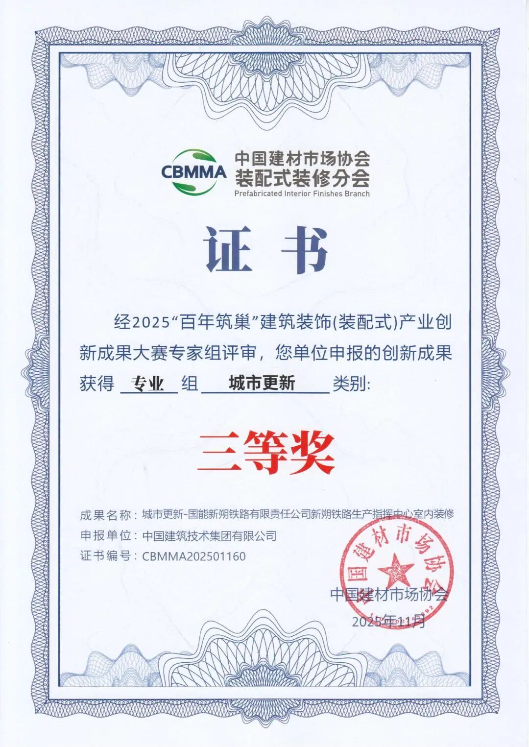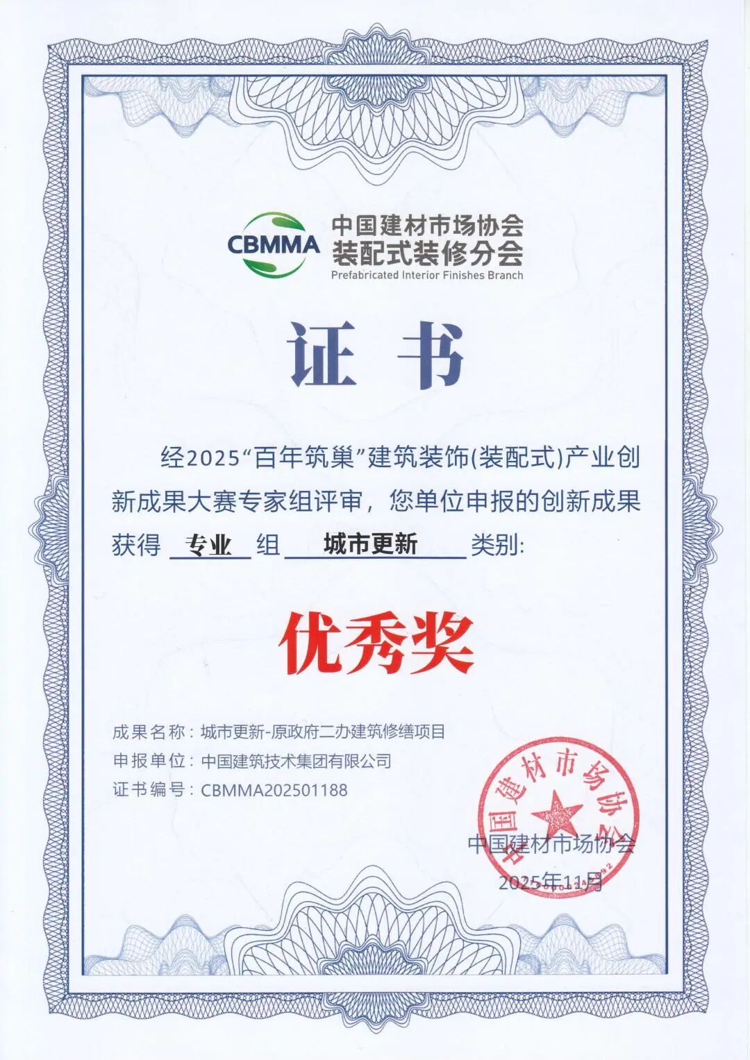 11月13日,由中國(guó)建材市場(chǎng)協(xié)會(huì)、中國(guó)建材市場(chǎng)協(xié)會(huì)裝配式裝修分會(huì)主辦的2025首屆裝配式裝修產(chǎn)業(yè)大會(huì)在浙江海寧會(huì)展中心舉行。中國(guó)建技所屬三個(gè)項(xiàng)目在大會(huì)同期舉辦的2025“百年筑巢”建筑裝飾(裝配式)產(chǎn)業(yè)創(chuàng)新成果大賽中獲獎(jiǎng)。