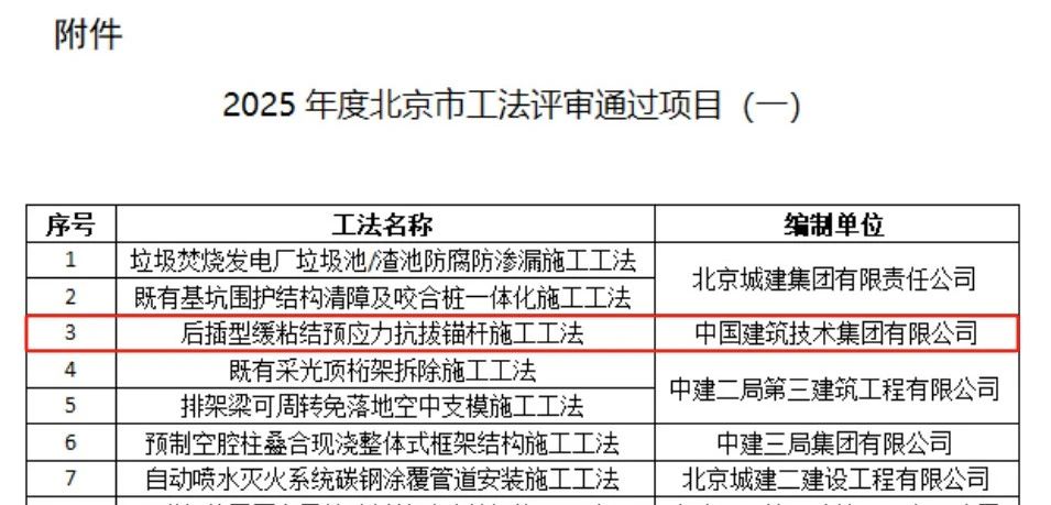 近日,由中國建技申報(bào)的“后插型緩粘結(jié)預(yù)應(yīng)力抗拔錨桿施工工法”通過了北京市住房和城鄉(xiāng)建設(shè)委員會(huì)組織的北京市工法專家評審,這一成果標(biāo)志著中國建技在技術(shù)創(chuàng)新、施工質(zhì)量和項(xiàng)目管理等方面實(shí)現(xiàn)了新的突破。