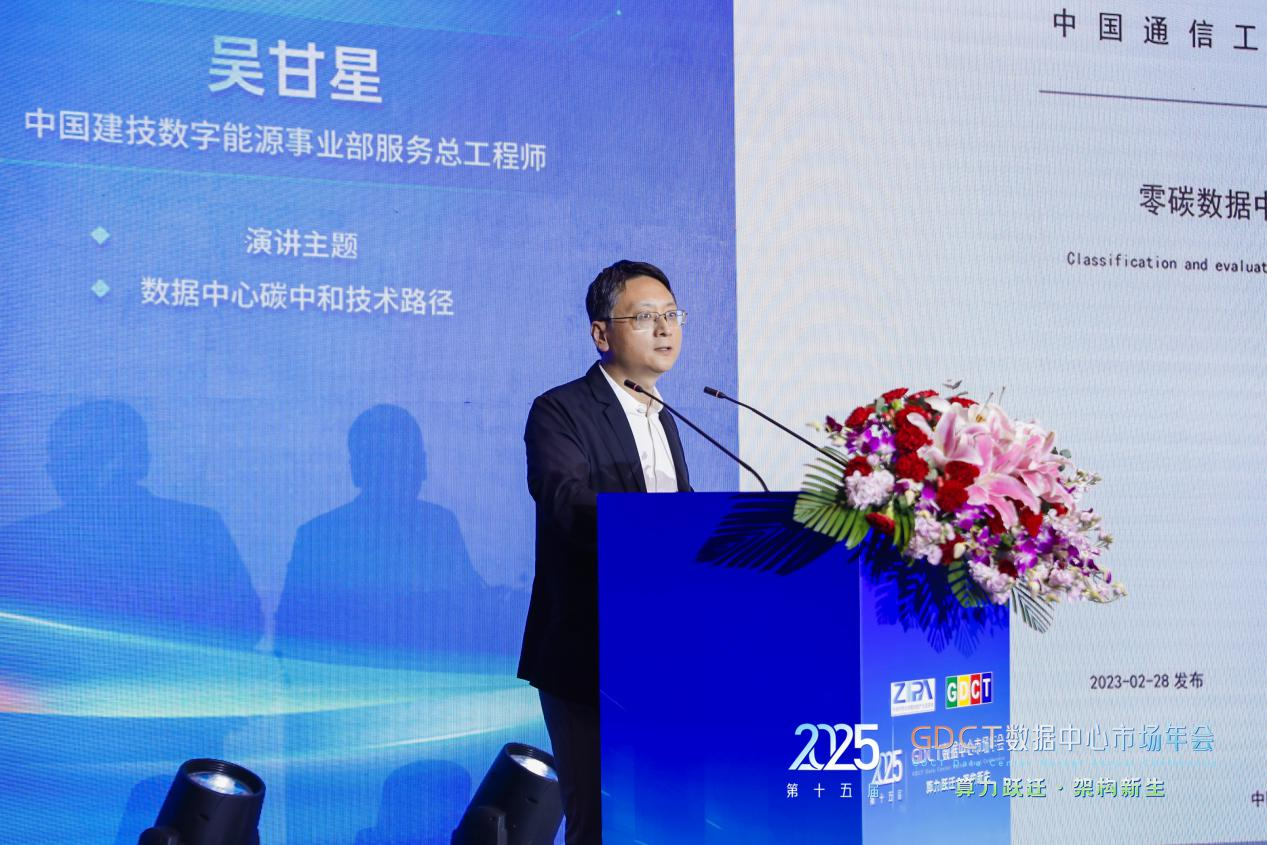 中國建技數(shù)字能源事業(yè)部服務(wù)總工程師吳甘星分享了主題為《數(shù)據(jù)中心碳中和技術(shù)路徑》的主旨演講,系統(tǒng)闡釋了數(shù)據(jù)中心碳足跡分析方法及碳中和技術(shù)路線,提出“能源側(cè)清潔化、用能側(cè)高效化、管理側(cè)智能化”的三角支撐體系,并分享了中國建技在碳中領(lǐng)域的科研創(chuàng)新成果和工程實踐經(jīng)驗。