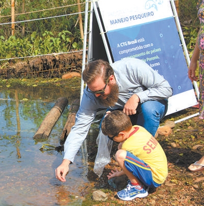 在位于巴西圣保羅州的伊利亞電站附近,三峽巴西員工帶領(lǐng)電站周邊社區(qū)孩子一起放流魚苗,并講解相關(guān)知識。三峽巴西供圖