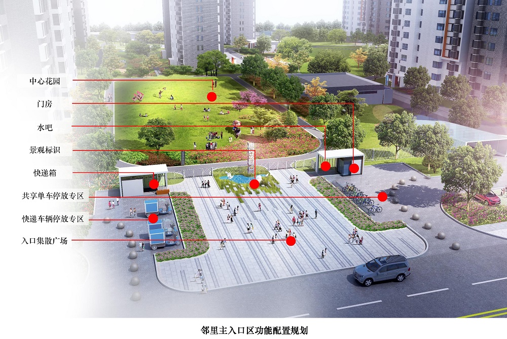 主入口實行人車分流組織,設(shè)置集散廣場、景觀標(biāo)識和中心花園。精細化布局門房、快遞箱、水吧、共享單車與快遞車輛停放專區(qū),形成功能強大的新型住區(qū)入口服務(wù)系統(tǒng)。