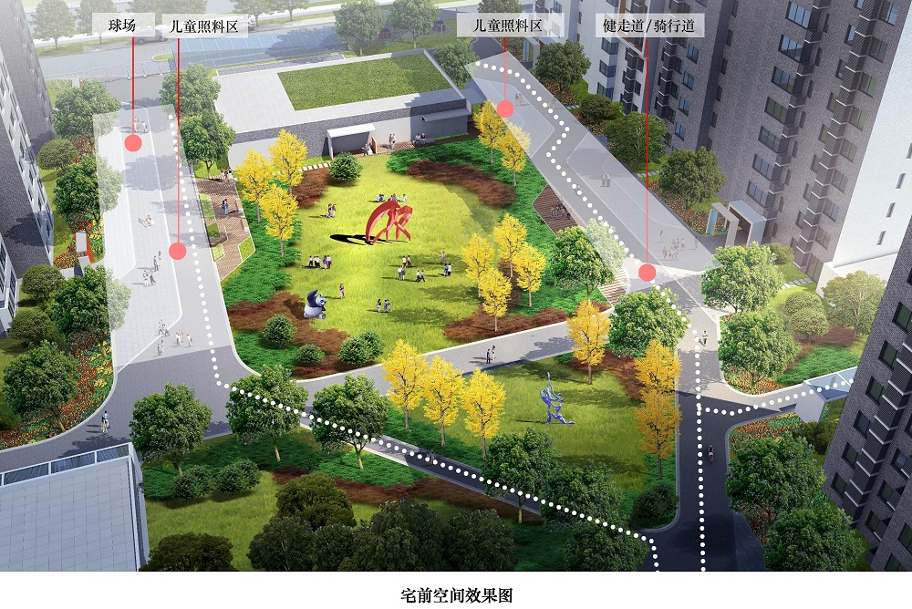 利用宅前消防登高場地規(guī)劃打球、健走、騎行和兒童照料等內(nèi)容,將宅前空間作為單元住戶的交往活力場所。活動場地外擴,結(jié)合綠化布置休閑座椅、花池廊架和文化藝術(shù)裝置,合理布局自行車棚、信報箱、垃圾收集箱和配電室等項設(shè)施。單元樓門設(shè)置入口標(biāo)識和門禁,居民活動也能對樓宇安全發(fā)揮良好的監(jiān)控作用。