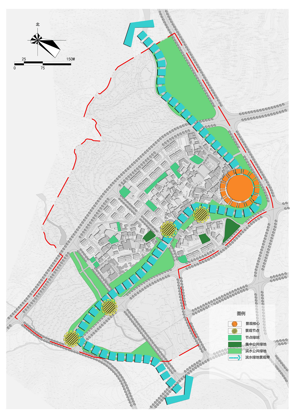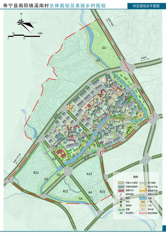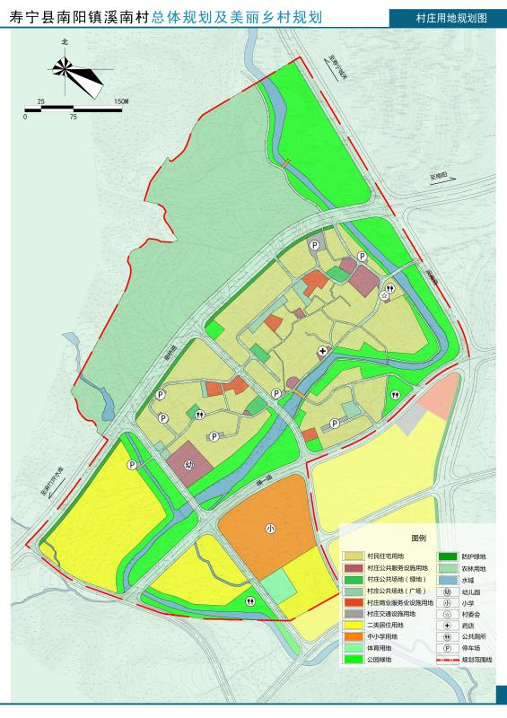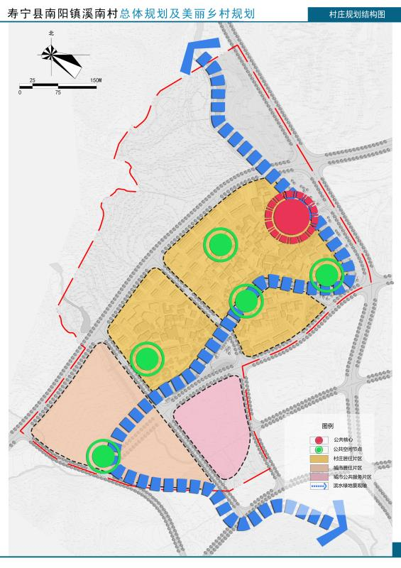 (1)結(jié)構(gòu):村莊建設(shè)發(fā)展區(qū)規(guī)劃形成“一核、一帶、五片、多點(diǎn)”——?一核:以村委、村民文化活動公園所形成的公共核心;一帶:沿溪南村傍村而過的溪南溪所形成的濱水綠地景觀帶;五片:①依據(jù)建設(shè)情況劃分成的北部村莊居住片區(qū);②中部村莊居住片區(qū);③南部村莊居住片區(qū)與村;④西南部城市居住片區(qū);⑤城市公共服務(wù)片區(qū)