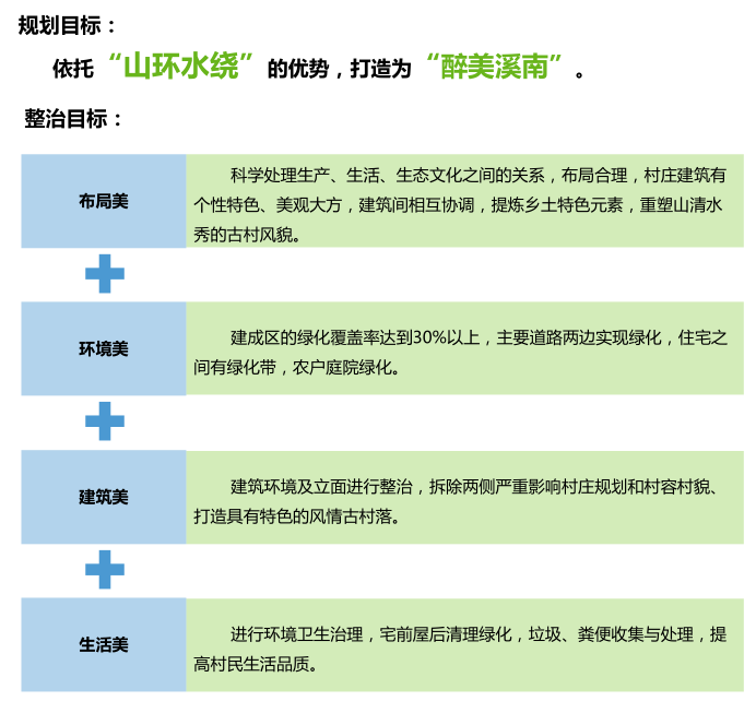 規(guī)劃目標(biāo):依托“山環(huán)水繞”的優(yōu)勢,打造“醉美溪南”。整治目標(biāo):建設(shè)“布局美、環(huán)境美、建筑美、生活美”的“四美”溪南。