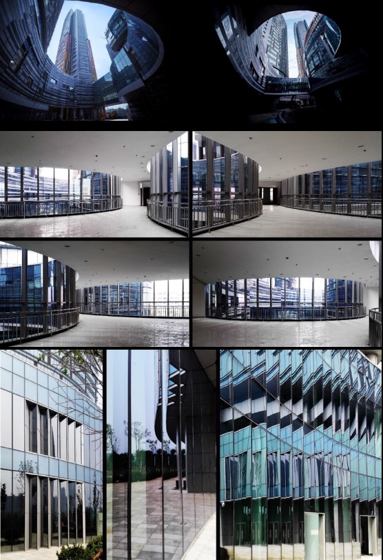 建筑空間設(shè)計以“自由流動”構(gòu)筑了步行街、庭院及室內(nèi)空間體驗的基本特征,連續(xù)塑造了引導(dǎo)漫步徐行、激發(fā)交流互動的事件場所,不斷暗示著“伴水而生”的獨特環(huán)境感知。而建筑立面設(shè)計以玻璃這一常規(guī)材料的非常規(guī)組合應(yīng)用,探討了“環(huán)境影像”積極介入并與實體環(huán)境互動對話的可能性。反射所形成的“虛線化的環(huán)境影像”被重新植入到連續(xù)的物質(zhì)環(huán)境之中,以其超現(xiàn)實的陌生感激發(fā)了人們對習(xí)以為常、視而不見的自然環(huán)境的重新關(guān)注與感知。