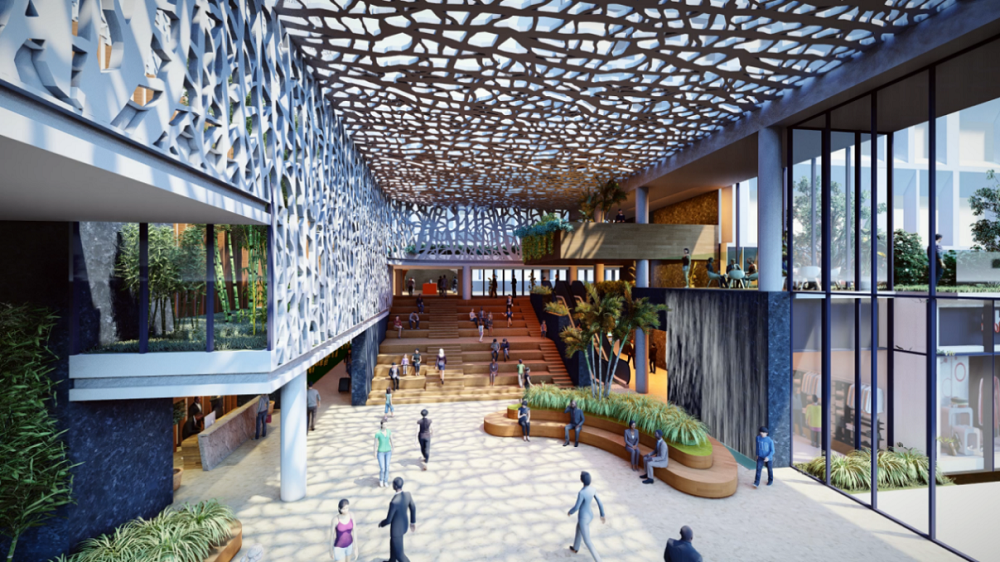 針對項目的所處區(qū)域環(huán)境、既有建筑群空間與土建現(xiàn)狀等現(xiàn)實挑戰(zhàn),規(guī)劃設(shè)計提出打造集住宿、工作、社交、休閑于一體的商務(wù)生態(tài)閉環(huán)策略。通過連通首層商業(yè)東線、塑造小鎮(zhèn)中心、加建空中連廊、改建局部空間等方式,將首層商業(yè)社區(qū)、二層酒店社區(qū)與上層商務(wù)辦公社區(qū)多業(yè)態(tài)由平面復(fù)合街區(qū)轉(zhuǎn)向為立體復(fù)合街區(qū),以構(gòu)建更具溫度感的生活情景,加強侵入式的極致體驗,提升服務(wù)資源的共享品質(zhì),創(chuàng)造多樣化的空間視點,引發(fā)不同視角下對生活的獨特感悟。